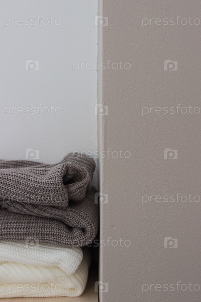 Стопка шерстяных свитеров на полке. Серо-белый свитер. Теплый и уютный. Вязаная одежда. зимняя одежда