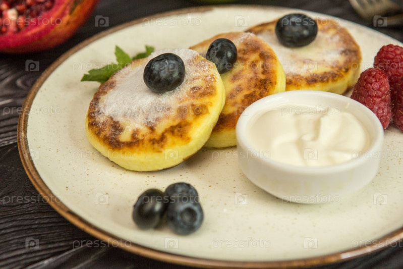 Сырники, сырники, оладьи из рикотты со свежими ягодами, медом и сметаной на сером бетонном фоне. Здоровый и вкусный завтрак