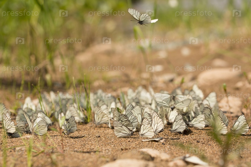 Большая флуоресцентная бабочка апория боярышница лат. Aporia crataegi . скопление бабочек на влажной почве