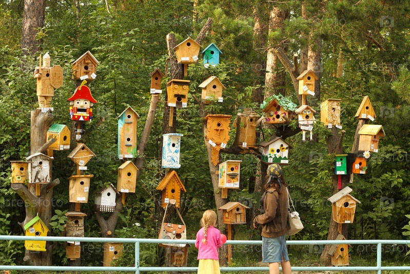 В качестве декораций в парке установлены разноцветные яркие деревянные скворечники и домики для птиц