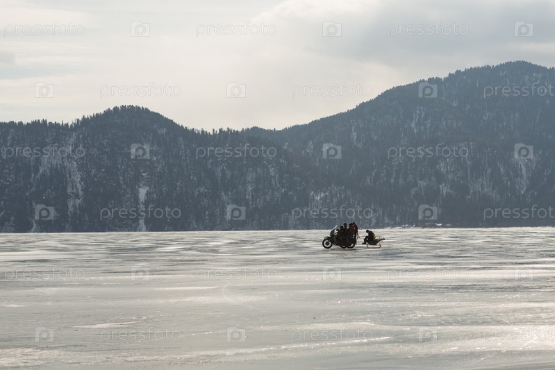 Вид на красивые рисунки на льду из трещин на поверхности Телецкого озера зимой, Россия