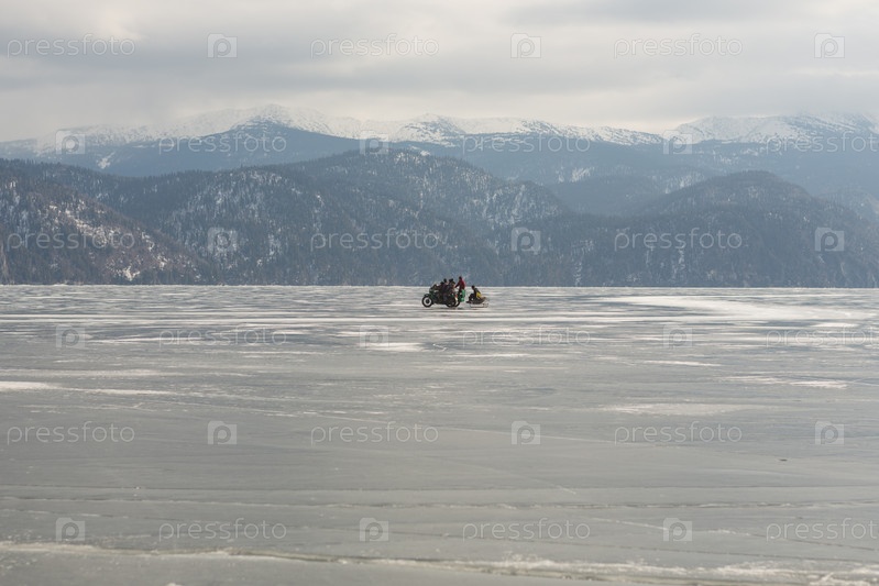 Вид на красивые рисунки на льду из трещин и пузырьков глубинного газа на поверхности Телецкого озера зимой, Россия