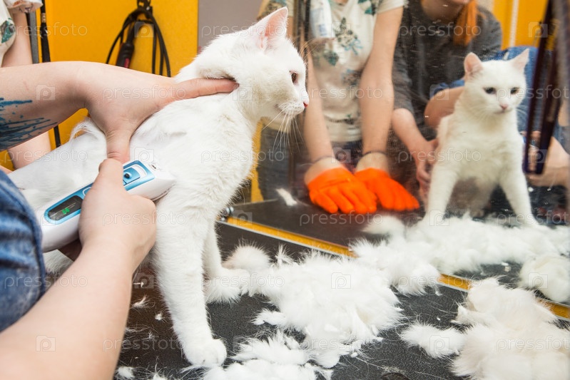 Стрижка кошек в салоне для животных. Женщина использует триммер для стрижки шерсти
