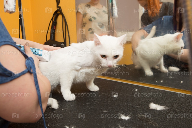 Стрижка кошек в салоне для животных. Женщина использует триммер для стрижки шерсти
