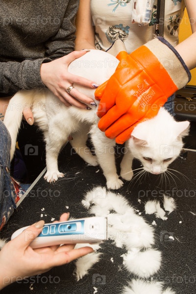 Стрижка кошек в салоне для животных. Женщина использует триммер для стрижки шерсти