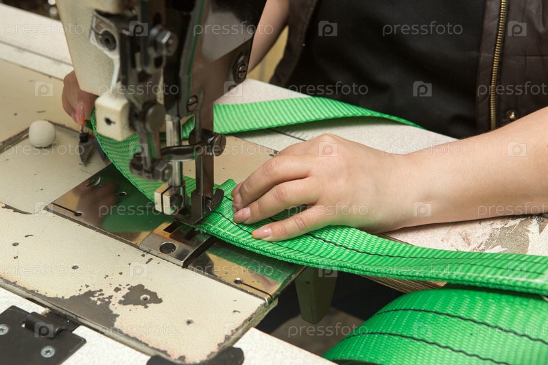 Промышленная швейная машина шьет ленточную стропу. Производство текстильных строп и стяжных ремней
