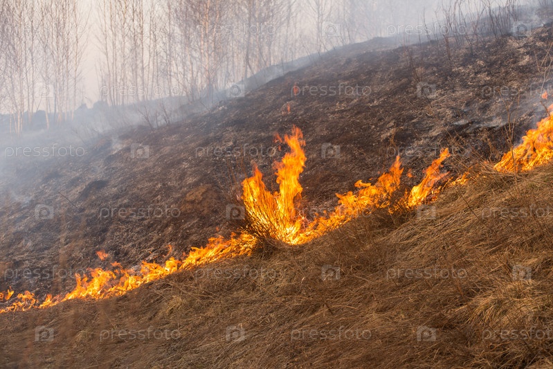 Лесной пожар горит, лесной пожар крупным планом в дневное время