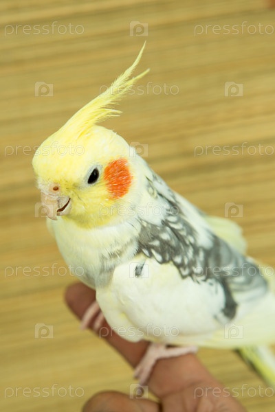 Желтый попугай корелла с красными щеками и длинными перьями