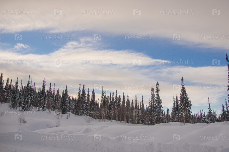 Заснеженный сосновый лес в природе во время шторма