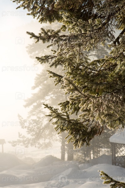 Ветка ели, покрытая инеем. Избирательный фокус