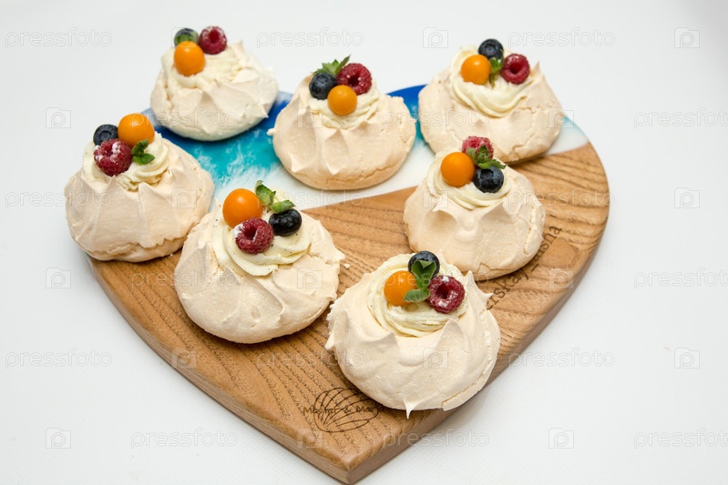 Торт Павлова. Пирожные на блюде. Сладкий десерт. Угощение для гостей. Десерт на праздник. Торт украшен ягодами