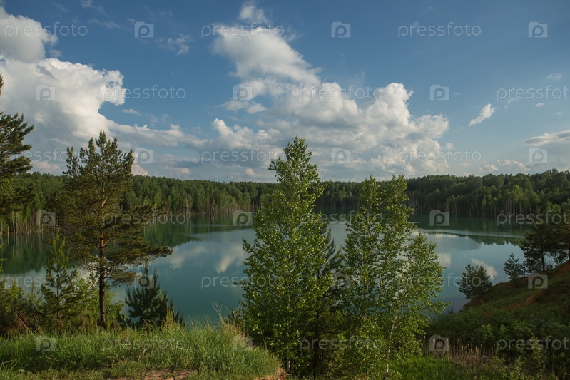 Лесной пейзаж озеро. Вид на голубое озеро лес
