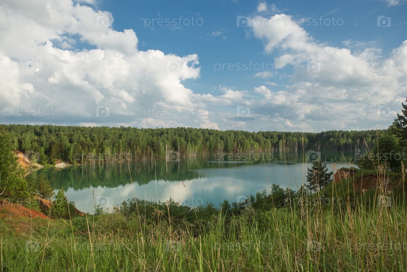 Лесной пейзаж озеро. Вид на голубое озеро лес