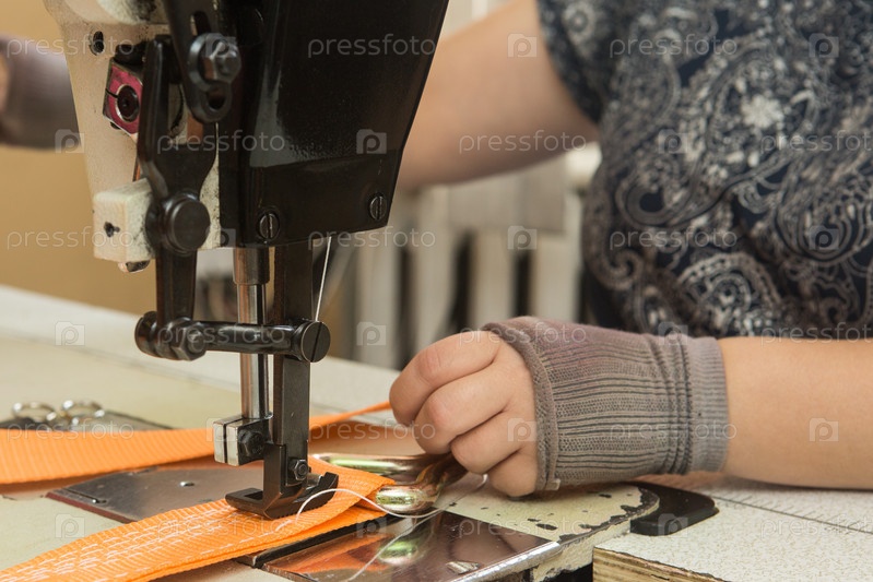 Промышленная швейная машина шьет ленточную стропу. Производство текстильных строп и стяжных ремней