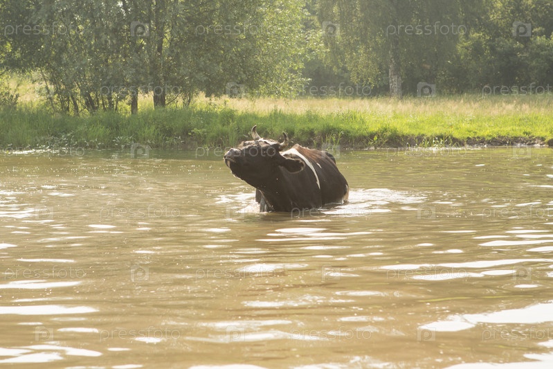 Корова купается в небольшой речке
