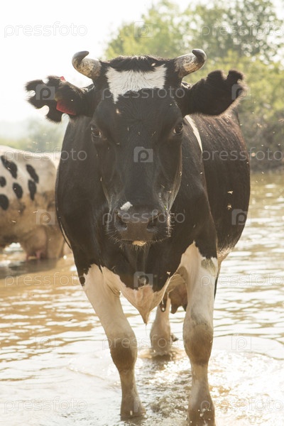 Корова купается в небольшой речке