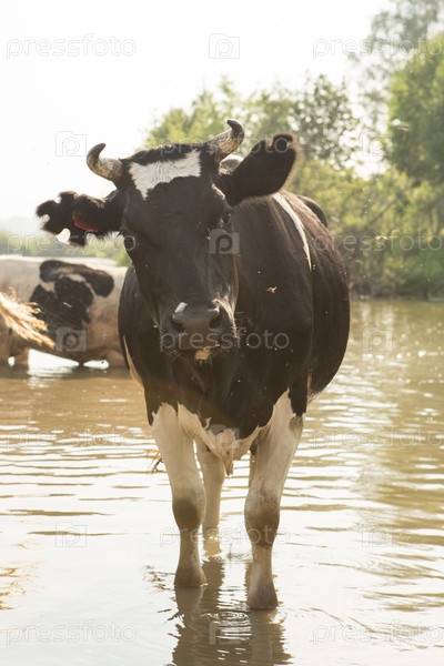 Корова купается в небольшой речке