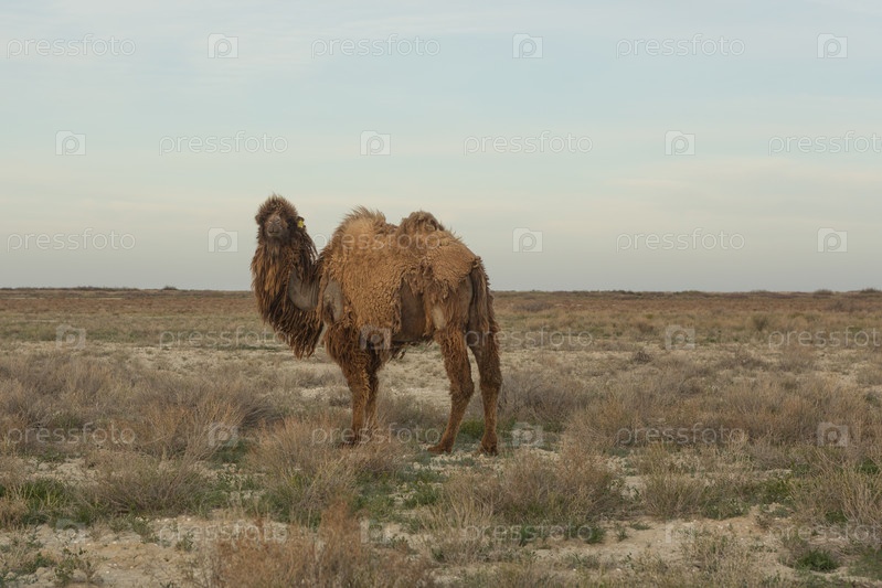 Верблюд идет по сухой степи в Средней Азии. Казахстан