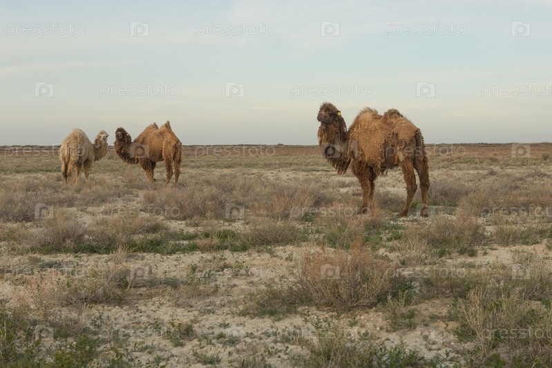 Верблюд идет по сухой степи в Средней Азии. Казахстан