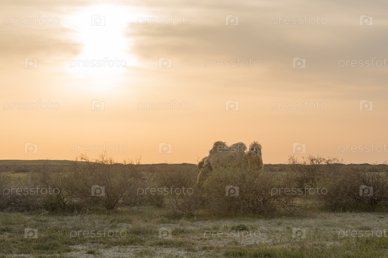 Верблюд идет по сухой степи в Средней Азии. Казахстан