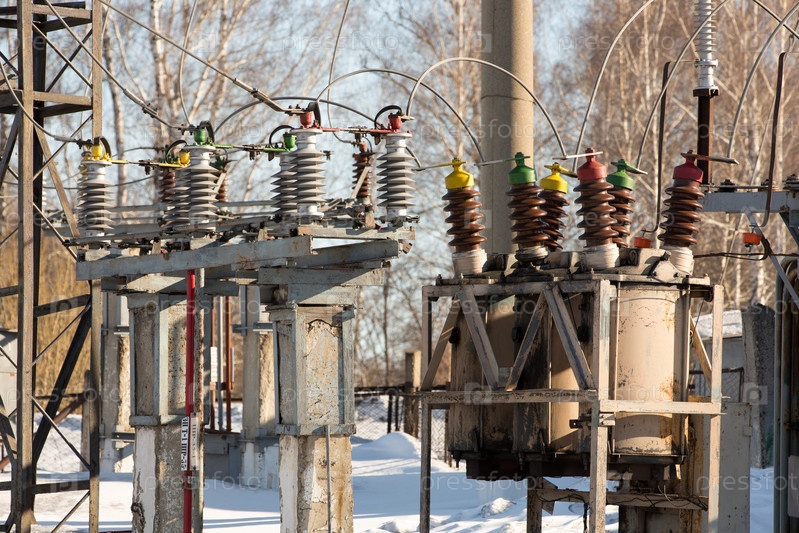 Высоковольтная электрическая подстанция в зимний день