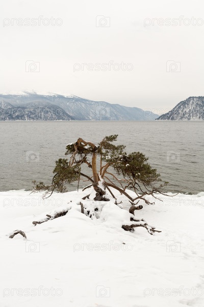 Достопримечательность Телецкого озера — наклонившаяся сосна незамерзающее Телецкое озеро зимой. Россия Алтайский край