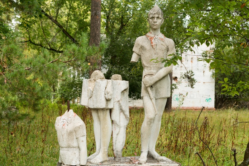 Старая скульптура детей в заброшенном пионерском лагере