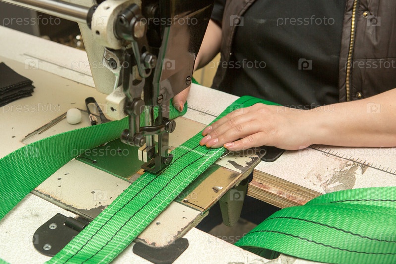 Промышленная швейная машина шьет ленточную стропу. Производство текстильных строп и стяжных ремней