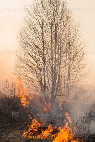 Лесной пожар горит, лесной пожар крупным планом в дневное время