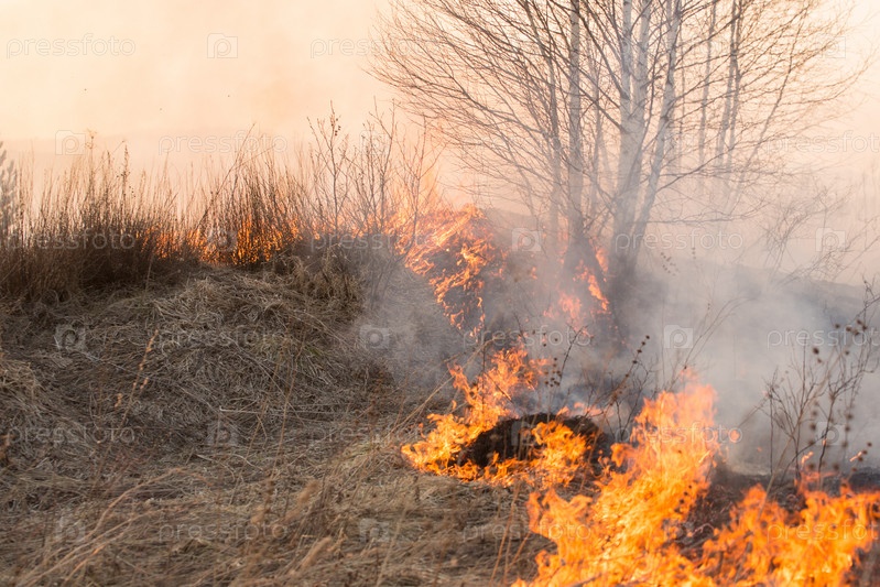 Лесной пожар горит, лесной пожар крупным планом в дневное время