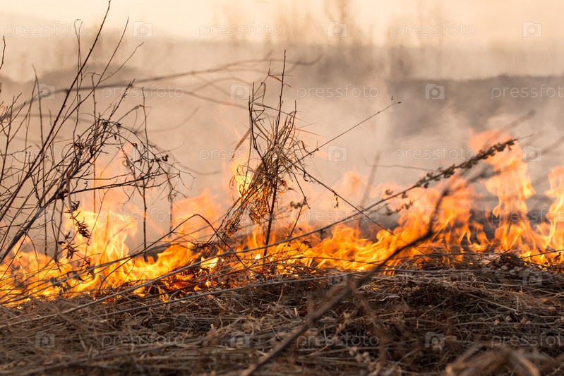 Лесной пожар горит, лесной пожар крупным планом в дневное время