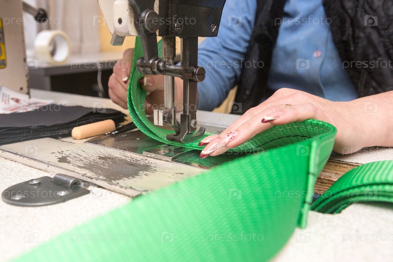 Промышленная швейная машина шьет ленточную стропу. Производство текстильных строп и стяжных ремней