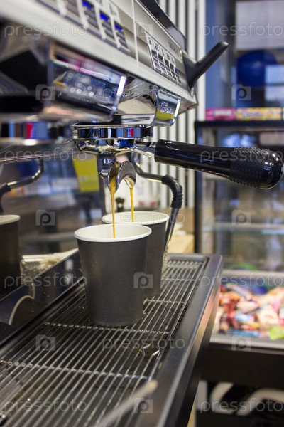 Кофе. Эспрессо. Кофемашина эспрессо варит кофе. в кофейнях