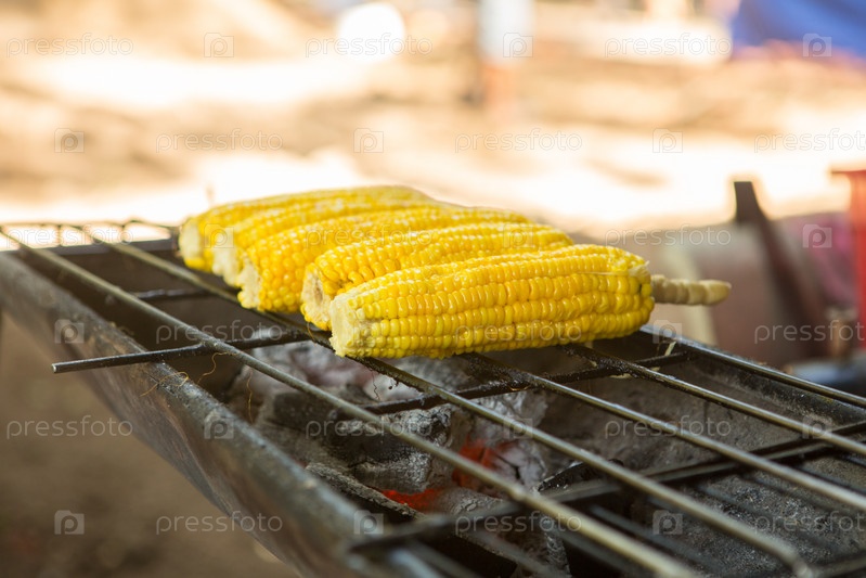 Жареная кукуруза. 3-4 овоща, жаренная на гриле кукуруза на горячей плите