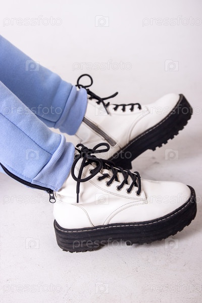 Женские кроссовки. Белые женские туфли на ногах. Кроссовки крупным планом