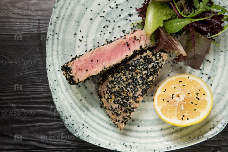 Домашний стейк из тунца на гриле с кунжутом и соевым соусом