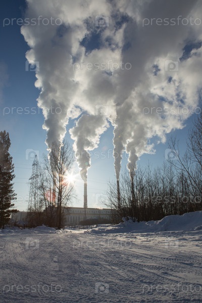 Промышленная концепция. Дымящиеся трубы или заводские трубы на фоне синего сумеречного неба