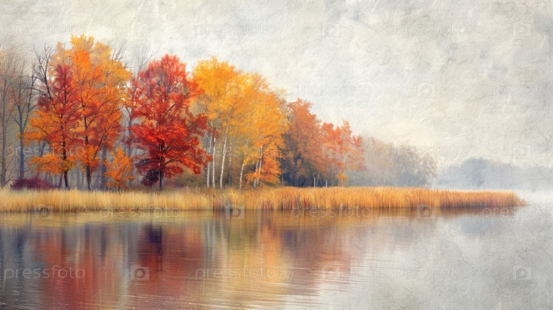Акварель и размытый осенний лес на берегу озера в пасмурную погоду