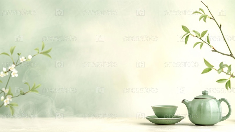 Зеленый нежный фон с пространством для текста, веточкой жасмина и керамическим салатом, чайником и зеленой миской, время чая