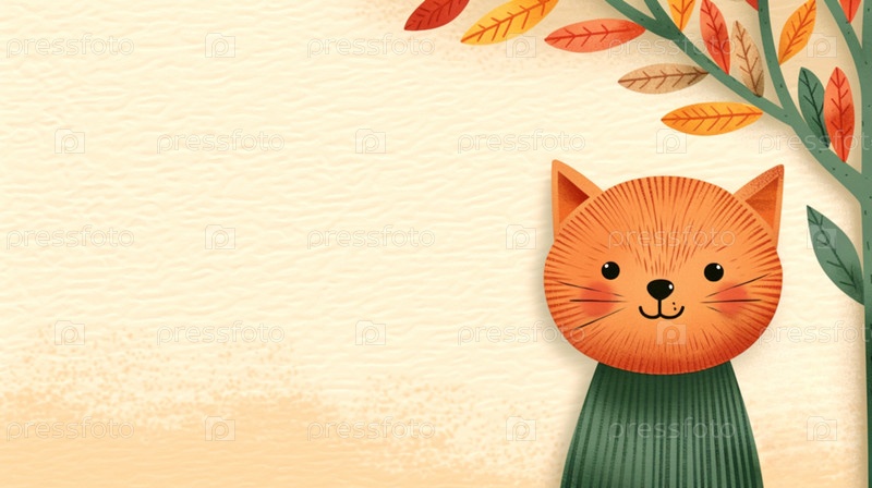 Веселый рыжий кот в зеленом свитере с веткой с разноцветными листьями на бежевом фоне с местом для текста