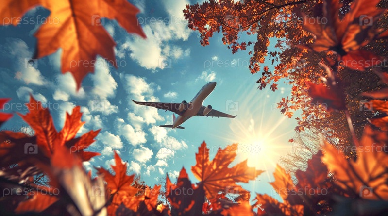 Самолет летит в синем осеннем небе, обрамляя красные кленовые листья, летит в отпуск осенью