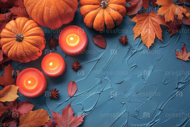Макет из кленовых листьев, зажженных свечей и тыкв вид сверху на синем фоне