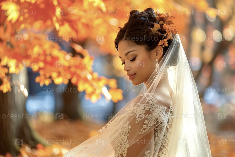 Невеста в свадебном платье на фоне размытого осеннего леса в солнечный день