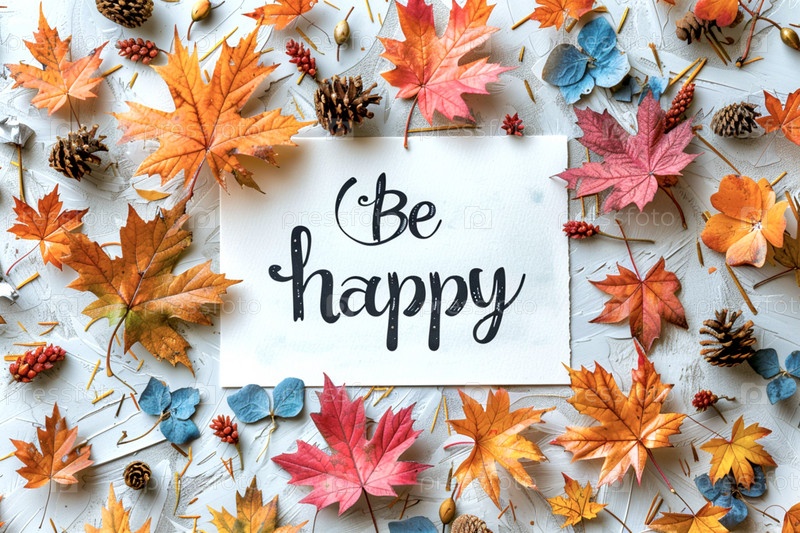 Открытка с осенними цветами на белом фоне и текстом «Будь счастлив»