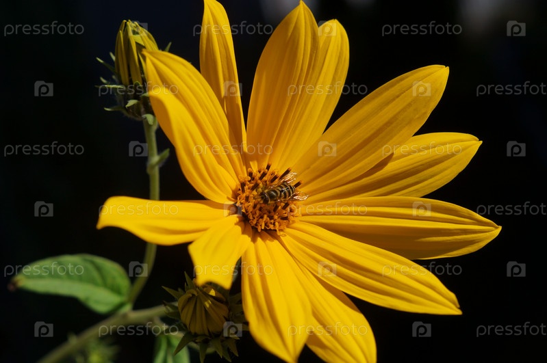 В центре распустившегося ярко желтого цветка топинамбура сидит пчелка