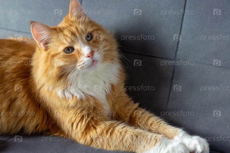 Рыжий кот на диване. Домашний пушистый кот лежит