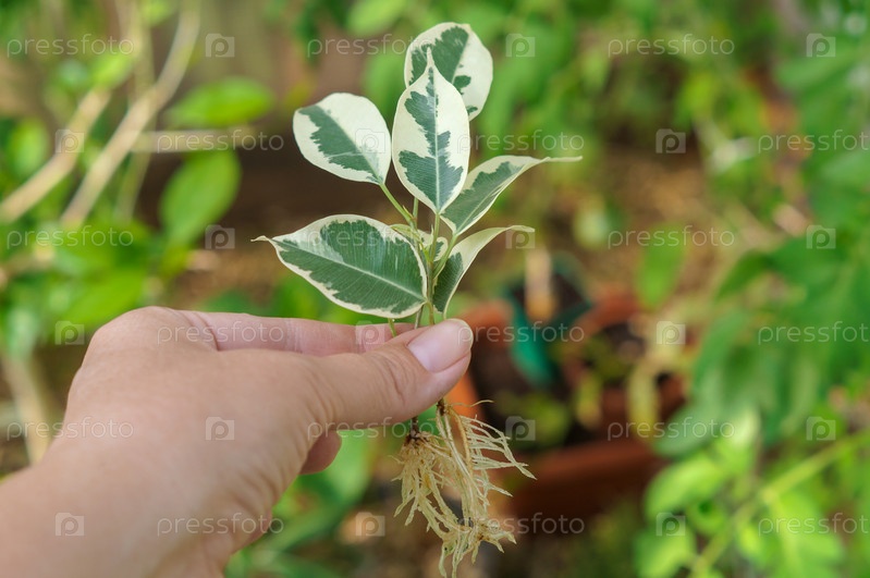 Два пёстролистых побега фикуса Twilight с отличной корневой системой в женской руке в теплице
