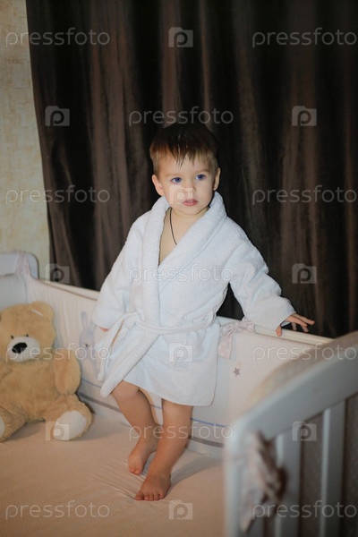Веселый и игривый малыш, одетый в уютный халат, с удовольствием исследует теплую обстановку детской комнаты