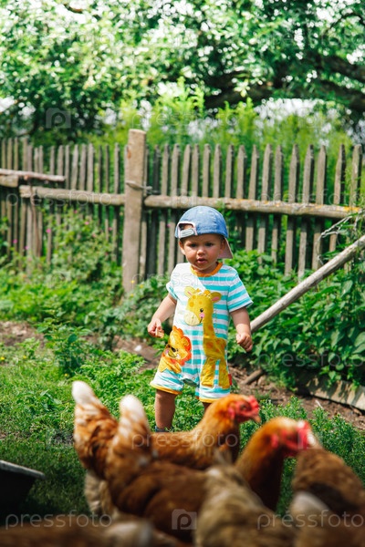 Веселый и счастливый ребенок с радостью общается с милыми цыплятами в ярком, солнечном саду фермерского двора