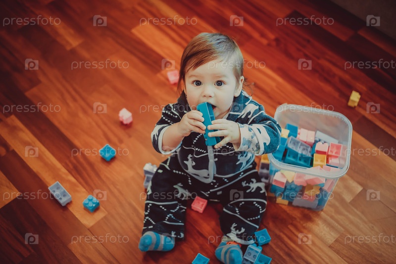 Любопытный и очаровательный малыш с удовольствием играет со разноцветными строительными блоками, разбросанными по деревянному полу